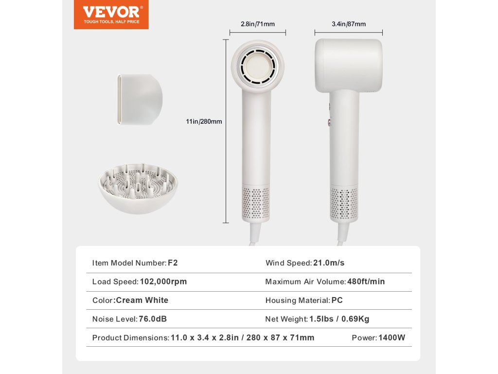 Hluk Úroveň: 76,0 dB, Rychlost zatížení: 105 000 ot./min., Materiál krytu: PC, Rychlost větru: 21,0 m/s, Barva: krémová bílá, Číslo modelu: F2, Maximální objem vzduchu: 580 stop/min, Rozměry produktu: 11,0 x 3,4 x 2,8 palce / 280 x 87 x 71 mm, Čistá hmotnost: 1,5 lbs / 0,69 kg, Výkon: 1250-1500W