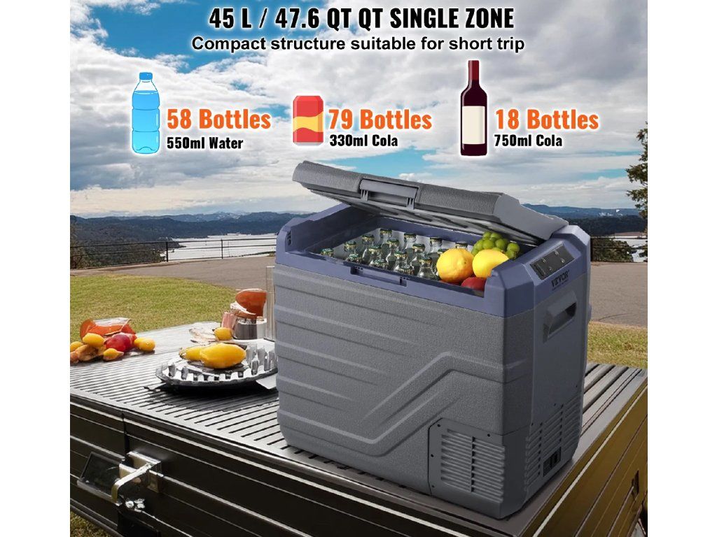 - Velká kapacita: Přenosná chladnička s mrazákem má jeden prostor o objemu 45 litrů. Tato robustní lednice do obytných vozů pojme 79 plechovek coly o objemu 330 ml nebo 58 lahví vody o objemu 550 ml nebo 18 lahví červeného vína o objemu 750 ml, což pojme mořské plody, občerstvení, maso a nápoje a splní potřeby krátkých výletů, jako je cestování, plavba lodí a kempování.