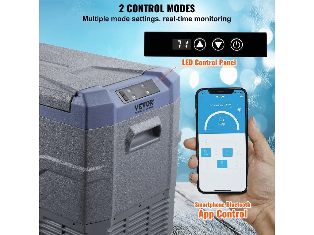 - Ovládání přes LED displej a Bluetooth: Ovládací panel LED umožňuje přímo sledovat provozní stav autochladničky a kdykoli upravit teplotní rozsah. Na panelu můžete nastavit libovolnou teplotu mezi -20 °C a 20 °C / -4 °F a 68 °F. Elektrická chladnička je také vybavena režimem Bluetooth, který umožňuje připojení k mobilní aplikaci pro dálkové ovládání.