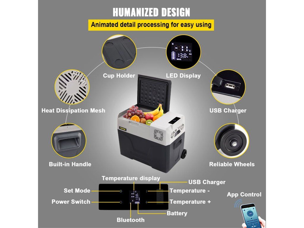 - Uživatelsky přívětivý design: Tato autochladnička je navržena s ohledem na pohodlí. Je vybavena hladkými kolečky a praktickými rukojeťmi pro snadnou manipulaci. Vnitřní LED osvětlení poskytuje jasný výhled do interiéru. Navíc obsahuje nabíjecí port pro telefon a digitální displej pro nastavení teploty. Držák na nápoje zajišťuje bezpečné umístění vašich nápojů.