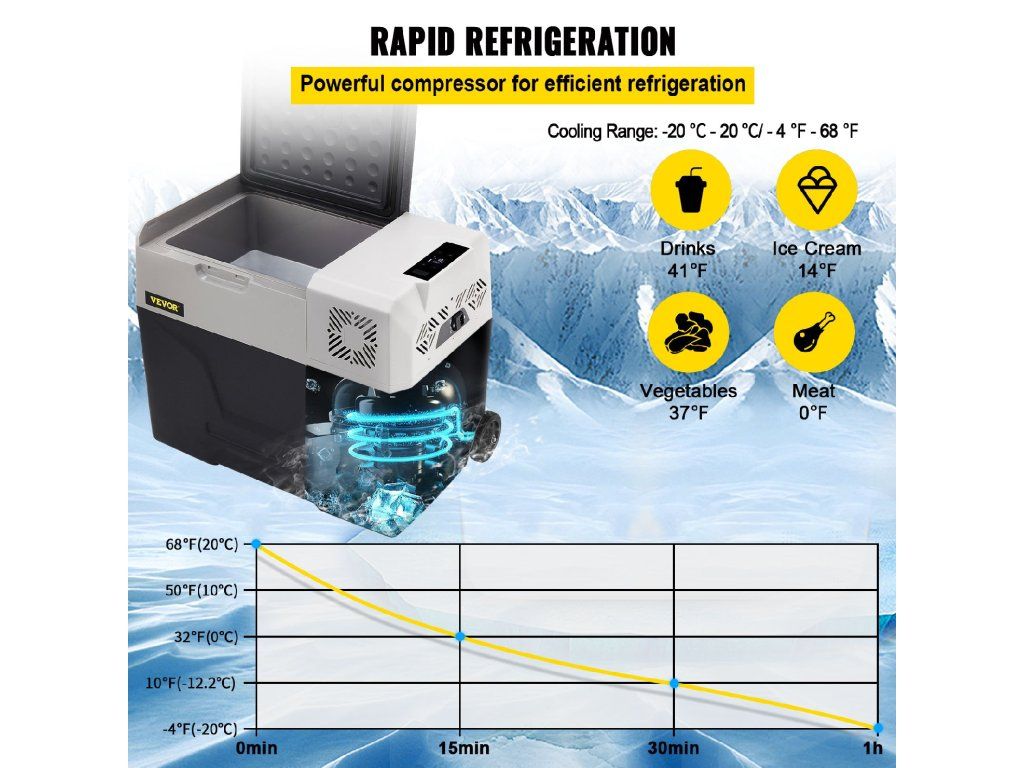- Rychlé chlazení: Zažijte rychlé a efektivní chlazení s naší mini autochladničkou. Díky vylepšenému kompresoru dokáže ochladit z 25 °C na -2 °C za pouhých 1,5 hodiny, což zajistí, že vaše nápoje a jídlo zůstanou osvěžující. Dokonce funguje bezchybně i při sklonu 45 °, což z ní činí ideálního společníka pro outdoorová dobrodružství nebo práci na cestách.
