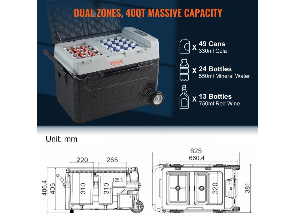 - Dvouzónová regulace teploty: Dvě zóny lze přizpůsobit pro izolaci nebo chlazení a teplotu lze nastavit v rozmezí -4 °F až 50 °F podle vašich specifických potřeb. Díky velkorysé celkové kapacitě 40 qt můžete snadno chladit a skladovat sortiment nápojů, ovoce, masa, mořských plodů a dalších produktů, a zajistit si tak vše, co potřebujete pro svá každodenní dobrodružství.