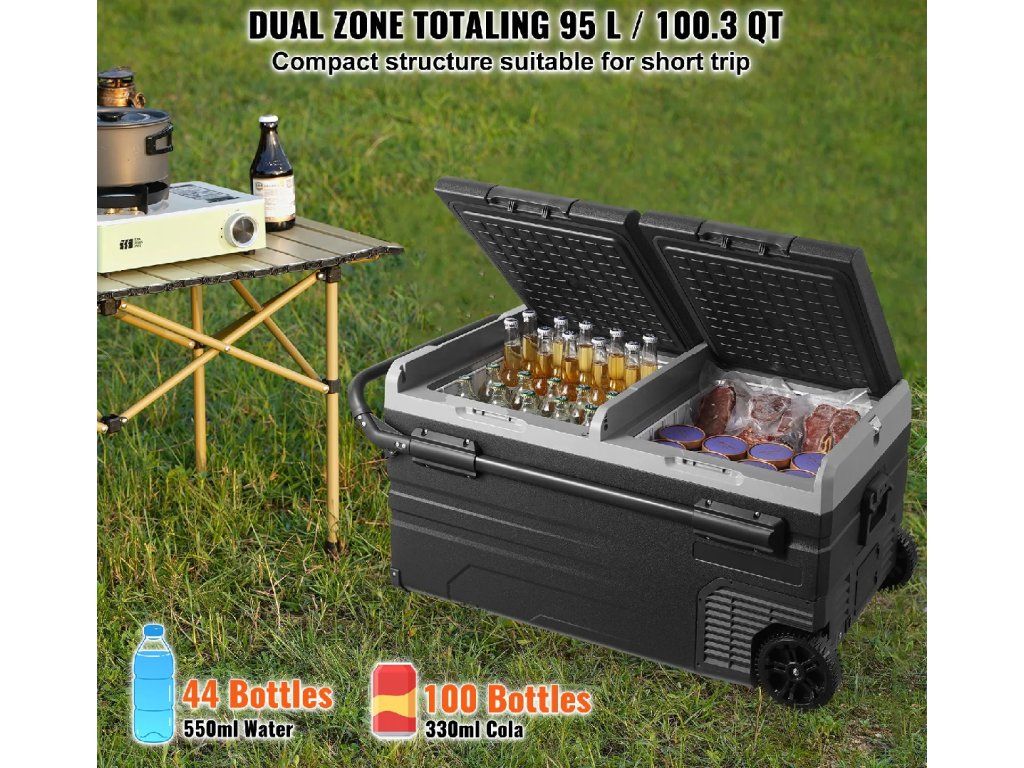 - Velká kapacita: Přenosná chladnička s mrazákem má dvojitou přihrádku o objemu 95 litrů. Tato robustní lednice pro obytné vozy pojme 100 plechovek coly o objemu 330 ml nebo 44 lahví vody o objemu 550 ml nebo 32 lahví červeného vína o objemu 750 ml, což pojme mořské plody, občerstvení, maso a nápoje a splní tak potřeby krátkých výletů, jako je cestování, plavba lodí a kempování.