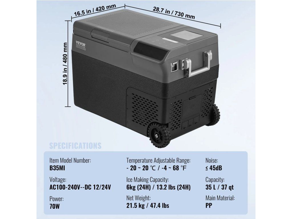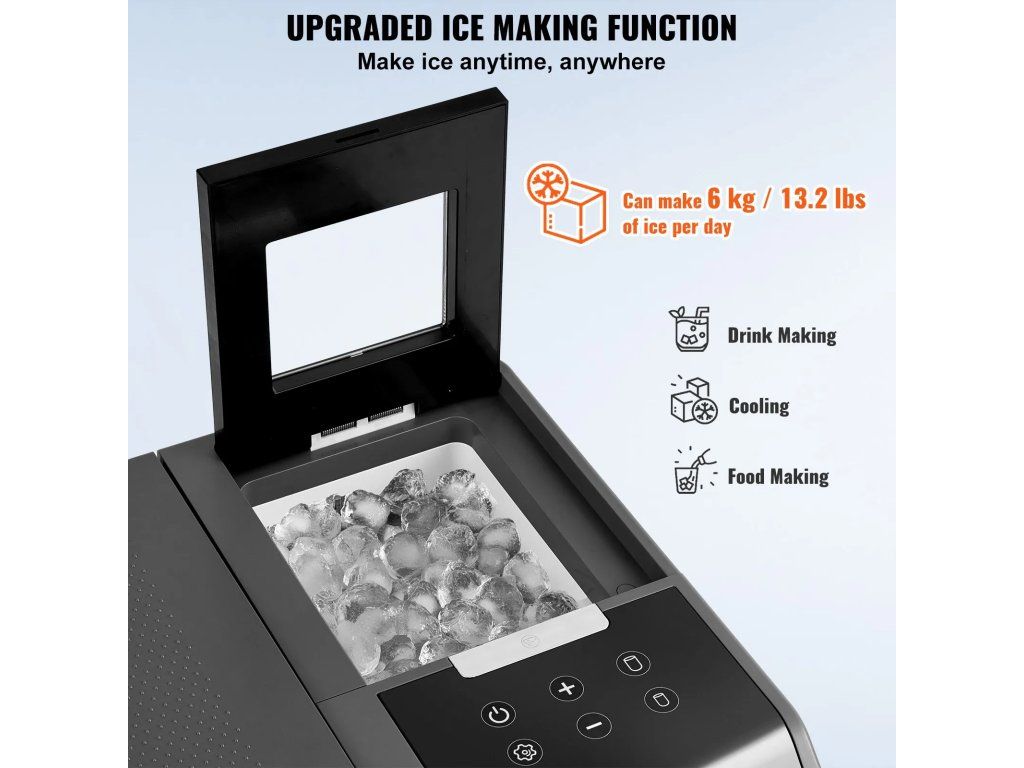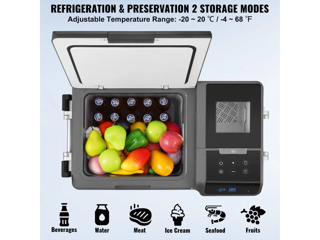 - Funkce výroby ledu: Tato autochladnička je vybavena funkcí výroby ledu a dokáže vyrobit 6 kg ledu denně, což vám zajistí čerstvý led, ať jste kdekoli. Dotykový ovládací panel umožňuje sledovat stav chladničky a upravovat teplotní rozsah s nastavením od -20 do 20 °C.