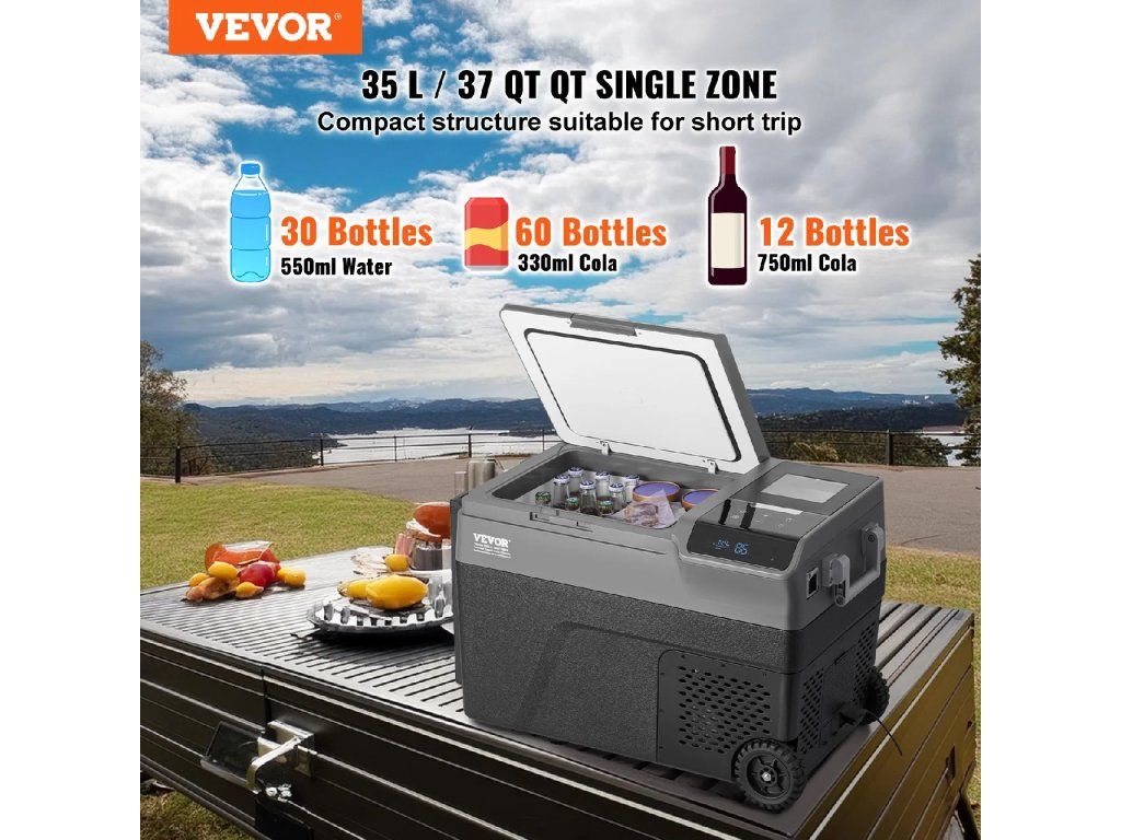 - Výkonná kapacita: Přenosná lednice s mrazákem má jeden prostor o objemu 35 litrů. Tato robustní lednice pro obytné vozy pojme 60 plechovek coly o objemu 330 ml nebo 30 lahví vody o objemu 550 ml nebo 12 lahví vína o objemu 750 ml a je ideální pro skladování mořských plodů, svačin, masa a nápojů. Splňuje potřeby pro krátké výlety, plavby lodí a kempování.