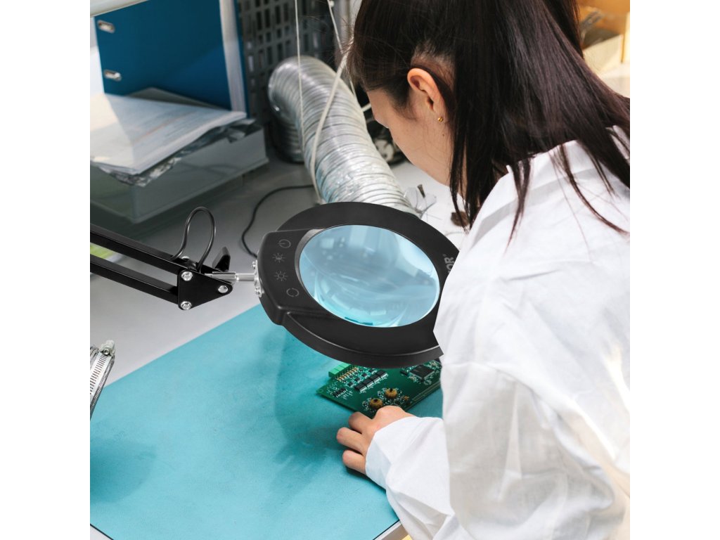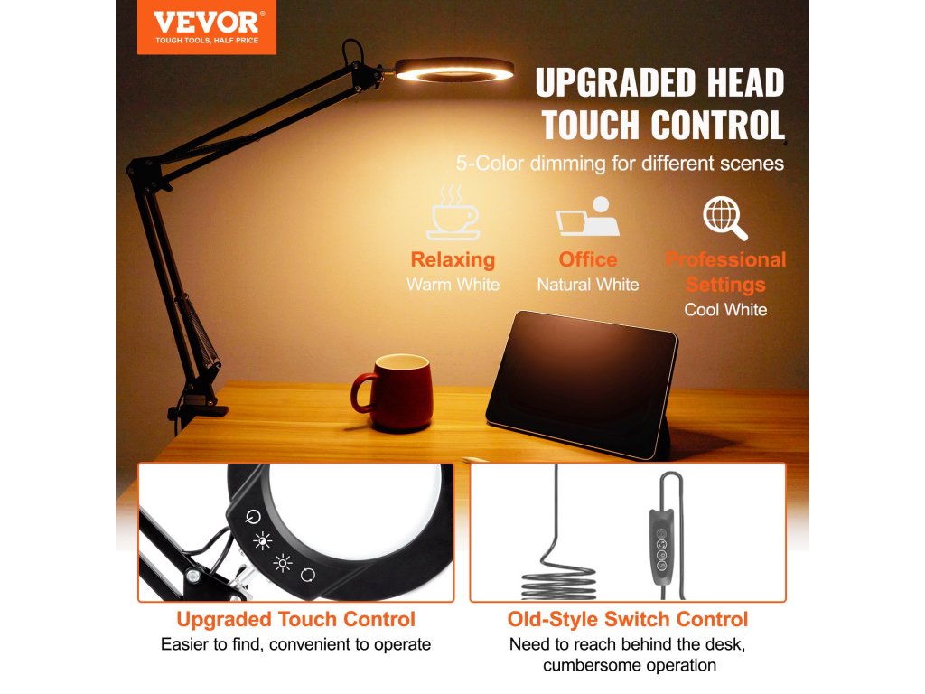 - Dotykové ovládání Smart Head: Rozlučte se s hrabáním se ve spínačích! Naše lupa se světlem je vybavena nejnovější technologií dotykového ovládání hlavy, která vám umožňuje bez námahy upravit teplotu barvy a jas světla pouhým jemným klepnutím. Už žádné starosti s hledáním vypínače za stolem – vše máte na dosah ruky!