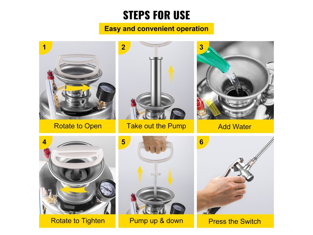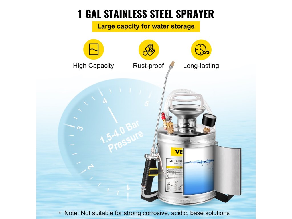 - Odolná nerezová ocel: Kapacita: 1,5 Gal; Tlak: 1,5-4,0 bar. Tento ruční pumpičkový postřikovač je vyroben z nerezové oceli, odolný proti korozi a odolný. Věnujte pozornost tomu, že pryžový kroužek a vnitřní provedení nejsou vhodné pro silně korozivní, kyselé a zásadité roztoky.