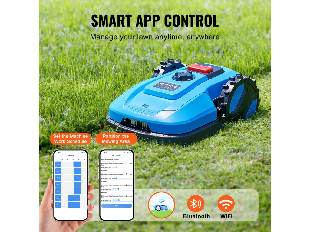 - Ovládání aplikací: Robotická sekačka se připojuje přes Bluetooth nebo WiFi a je kompatibilní se systémy iOS i Android. Uživatelé mohou sekačku ovládat a sledovat na dálku prostřednictvím aplikace pro chytré telefony, což usnadňuje správu a provoz. Aplikace umožňuje nastavení zón a vytváření úkolů na základě různých ploch trávníku, čímž se optimalizuje účinnost sečení.