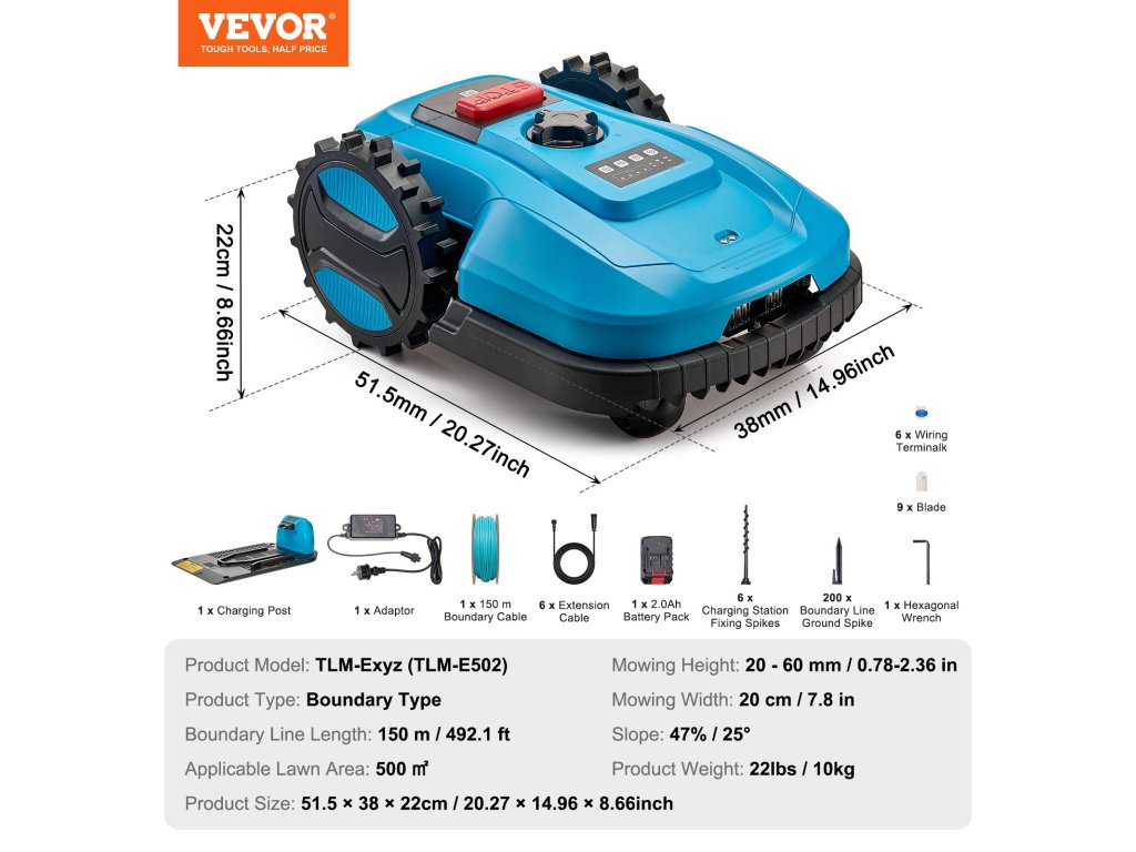 Typ produktu: Typ s ohraničením, Šířka sečení: 20 cm/7,8 in,Použitelná plocha trávníku: 500 ㎡,Hmotnost produktu: 10 kg/22 lbs,Model produktu: TLM-Exyz (TLM-E502),Délka hraniční čáry: 150 m/492,1 ft,Výška sečení: 20 - 60 mm/0,78- 2,36 palce, Sklon: 47 % / 25 °, Velikost produktu: 50 x 35 x 22 cm/19,6 x 13,7 x 8,6 palce