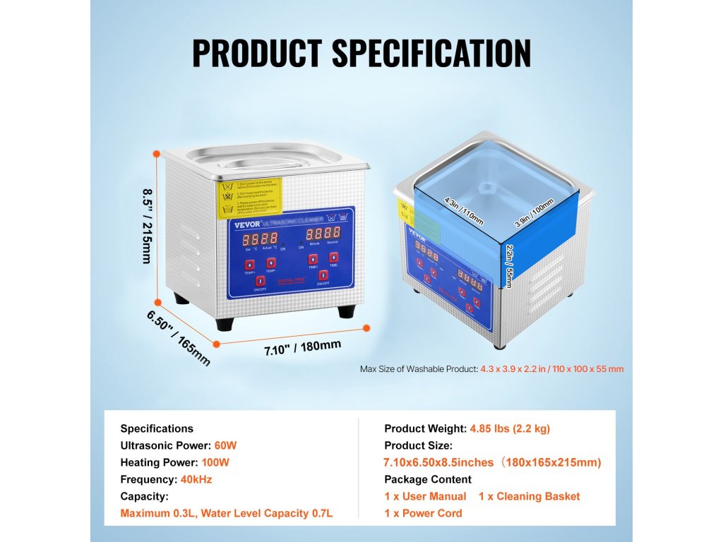 - Kvalita, které můžete věřit: Sonický čistič s nádrží z prémiové nerezové oceli SUS304 bezpečně drží a čistí různé cenné předměty, jako jsou šperky, brýle a hodinky. Důraz na detail zajišťuje, že každý předmět se dočká důkladného vyčištění. Maximální velikost omyvatelného výrobku: 110 x 100 x 55 mm