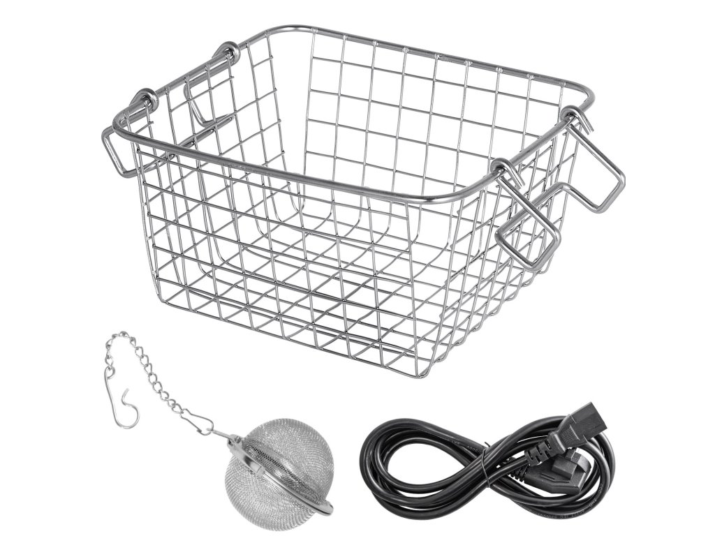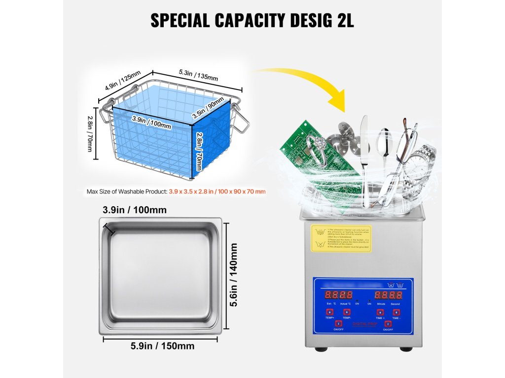 - 【PREMIUM MATERIÁL SUS304】 - Velikost nádrže: 1,8-2 l; Výkon ultrazvuku: 60 W. Tento ultrazvukový čistič je vyroben z robustní nerezové oceli 304, což zajišťuje, že nedochází k úniku vody a má dlouhou životnost. Kromě toho je k dispozici další košík pro snížení kolize ostrých předmětů s nádrží. Maximální velikost omyvatelného produktu: 3,9 x 3,5 x 2,8 palce / 100 x 90 x 70 mm