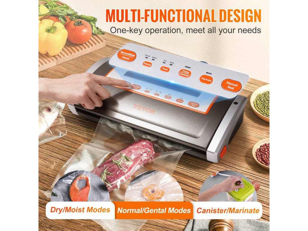 - Připraveni na cokoli: Hledáte všestrannou vakuovou zatavovačku, která to všechno zvládne? Díky schopnosti vakuovat suché i vlhké potraviny, marinovat pomocí externí hadice a rozhraní a zvolit dobu utěsnění a sílu vakua je tento stroj ideální pro všechny vaše potřeby při skladování potravin. A pokud dáváte přednost praktickému přístupu, nabízí také manuální ovládání a možnosti pouze těsnění. Je čas uzavřít svá oblíbená jídla tím nejúčinnějším a nejefektivnějším možným způsobem!