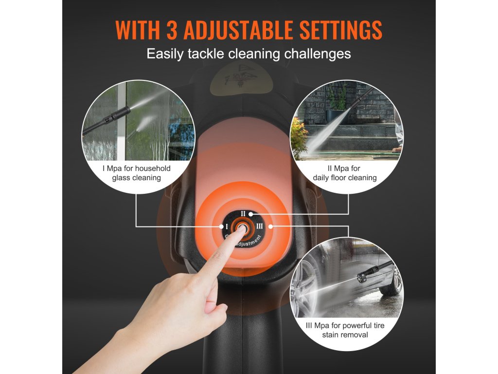 - 3 nastavení tlaku: Vysoce výkonný čistič je dodáván se třemi nastavitelnými nastaveními tlaku. První nastavení nabízí 1,2Mpa nízký tlak pro šetrné mytí vhodné pro domácí sklo. Druhý při středním tlaku 1,6 Mpa je ideální pro velkoplošné čištění podlah a plotů. Třetí s vysokým tlakem 2,0 MPa účinně odstraňuje odolné nečistoty z sanitárních mrtvých rohů.