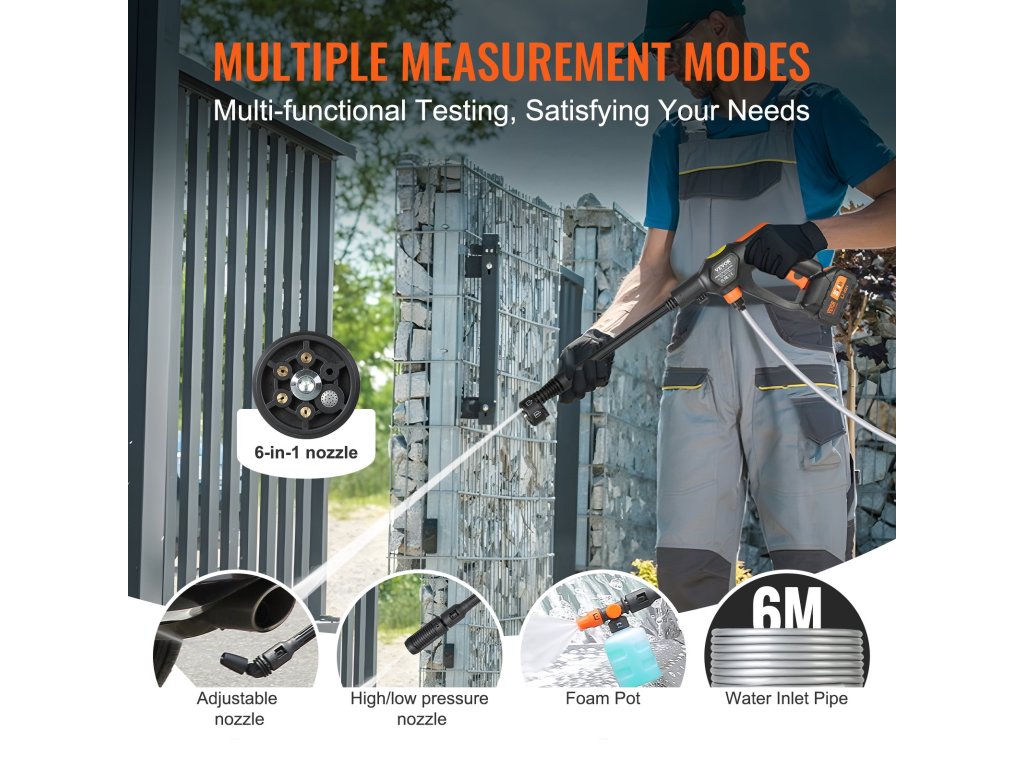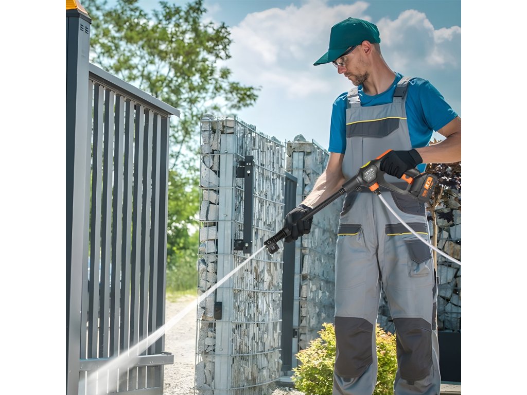 - 652PSI High Pressure: Akumulátorová tlaková myčka je dodávána se silným tlakem pro snadné odstranění odolných skvrn. S režimem běžného tlaku 290PSI pro každodenní čištění stěn a podlah a vysokotlakým režimem 652PSI s průtokem 1,1 GPM určeným pro auta a dlažební kostky se žádná špína neskryje.