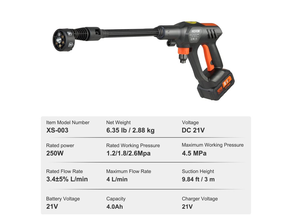 Napětí nabíječky: 21V, Rozměry produktu (DxŠxV): 11,81" x 8,66" x 3,35" / 300 x 220 x 85 mm,Hrubá hmotnost: 8,29 lbs / 3,76 kg (včetně veškerého příslušenství a balení),Napětí baterie: 21V, Kapacita: 4,0Ah, výška sání pokles): 9,84 ft / 3 m,Napětí: DC 21V,Maximální pracovní tlak (výbuch): 4,5 MPa,Položka Modelové číslo: XS-003,Maximální průtok: 4 l/min,Jmenovitý průtok: 3,4±5% L/min,Čistá hmotnost: 6,35 lbs / 2,88 kg (včetně veškerého příslušenství), Jmenovitý výkon: 250 W